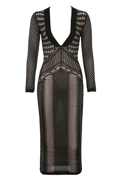$71.70FREE DELIVERY ON YOUR ORDER Description Cut from our luxury knit that's blended with plenty of stretch in timeless black, our 'Lilla' midi dress is ultra feminine. It's pencil silhouette features a low rounded neckline with a rouleau tie to the front and elongated short sleeves. The pretty openwork detail throughout…