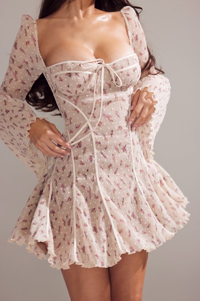 'Analissa' is made from a pretty dotted floral chiffon in a gorgeous rose print with delicate satin trims and underpinned with our figure cinching power mesh lining for coverage. It has underwired cups and 'Analissa' is supported by internal boning to cinch the waist. We love how the long sleeves have exaggerated pleated cuffs that match the floaty mini hem beautifully. It zips to the back for easy on and looks ultra chic paired with our 'Tao' barely there sandals in beige for your prettiest date night yet. The 'Regular Cup' option suits cup size A-C whilst the 'Bigger Cup' option suits cup size D-E. Taller girls, we heard you and this is available in two lengths, our regular mini length and 2 inches / 5cm longer. Regular length: Approx 80cm and Longer length: Approx 85cm. WHERE TO WEAR: