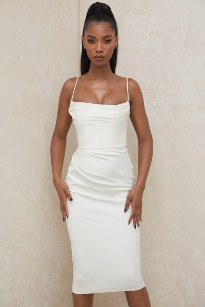 This figure perfecting creation is one of our absolute favourites this season. In a rich lustrous satin with delicate ivory tones, 'Anja' is flattering for every skin tone. It has a fully corseted internal bodice to give incredible cinching properties and it sits prettily over the booty. The midi skirt keeps it ultra classy and the slight stretch means that 'Anja' is super comfortable to wear. No bra necessary under this but you can wear a strapless bra if you prefer. Wear yours with neutral heels.