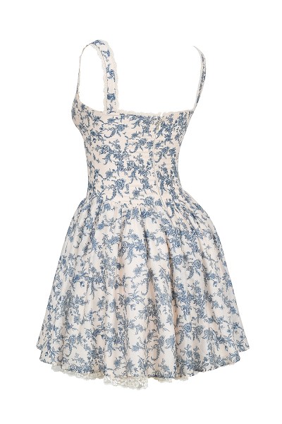 Our 'Brigitte' mini dress in a gorgeous English porcelain print is ultra feminine with a vintage feel. It has a corseted bodice for a cinched waist and a plunging shaped bust for gentle support. The delicate button detailing and flouncy mini skirt adds to the girlish feel, especially the soft tulle underskirt.