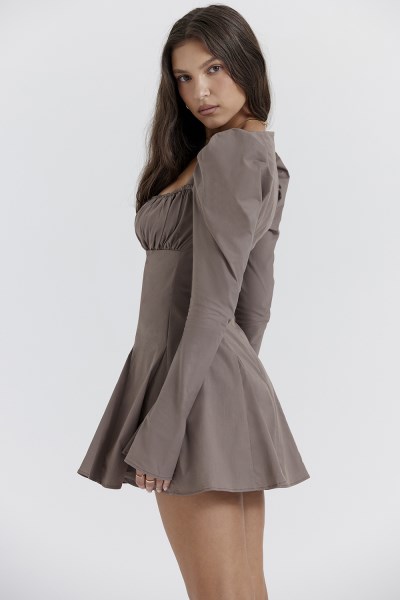Cut from stretch cotton in a dreamy mocha hue, 'Carlina' has a beautifully gathered bust for gentle support with delicate satin ties and designed with shrug shoulder long sleeves.