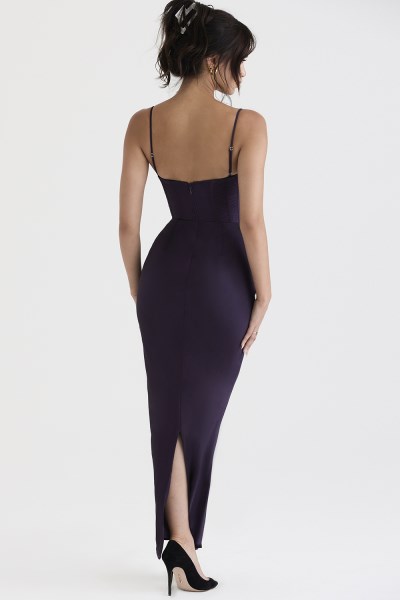 'Charmaine' is just the epitome of elegance and class, made from our lustrous silk satin in a deep nightshade hue and cut on the bias to gently skim your figure. It has a beautifully draped cowl neckline and the bodice features our incredible corsetry boning to cinch the figure in. The pretty half cups are softly lined and underwired for full support and uplift, framed by delicate shoulder straps that adjust for the perfect fit. The skirt falls to an elegant maxi hem and 'Charmaine' is fully lined for comfort with a zip to the back for easy on. Wear yours with dainty sandals like our 'Lucent' mules. The 'Regular Cup' option suits cup size A-C whilst the 'Bigger Cup' option suits cup size D-E.