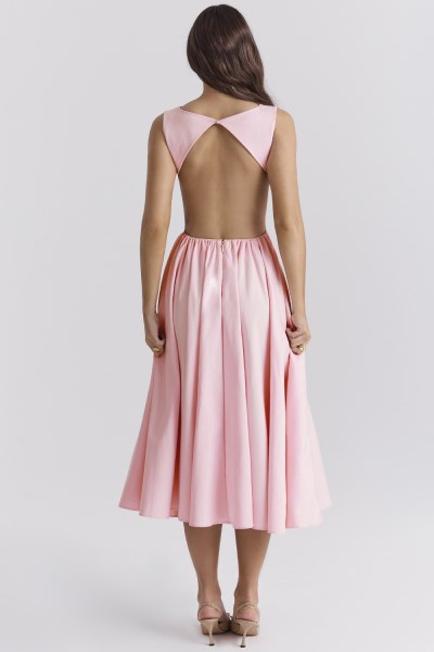 Our 'Cindy' dress has an elegant, effortless style that's inspired by our love for romantic designs. Made from soft peached Rayon twill, the gorgeous ballerina pink hue has a Spring-Summer feel that's perfect for dreamy destinations and pretty garden parties. The fitted bodice has a sleeveless silhouette and a subtle high neck that turns to reveal a dramatic open back. The romantic midi skirt falls beautifully to a floaty midi length and zips to the back for easy on. 'Cindy' is ultra wearable for warmer climates and we love yours paired with the dainty mules like 'Andromeda' in white. WHERE TO WEAR:
