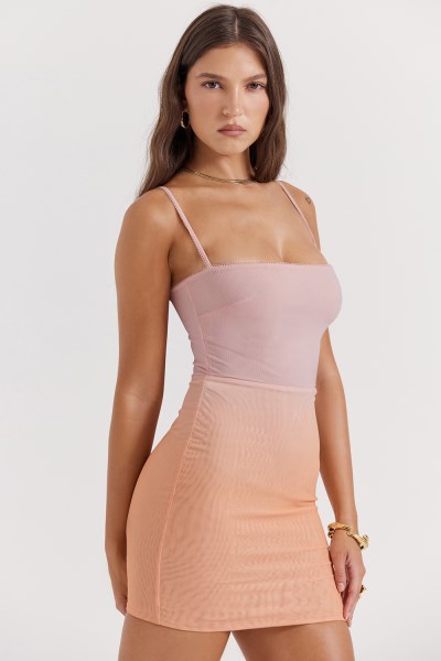Feel your most feminine in our 'Deva' mini dress. Cut for a figure skimming fit from soft stretch mesh and backed in our special power mesh to accentuate your curves, it has a pretty picot trim and adjustable straps. The bodice features our signature corsetry boning to the sides for a structured fit and the sleek silhouette falls to mid thigh.