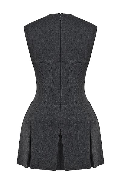 'Eleanor' will fit right into your early Fall wardrobe. Cut from our soft tailoring in a Charcoal hue, it reveals a plunging neckline in a sleeveless silhouette and features a feminine pleated skirt that's for showcasing great legs. The bodice is fitted with our incredible corsetry boning to cinch the waist.