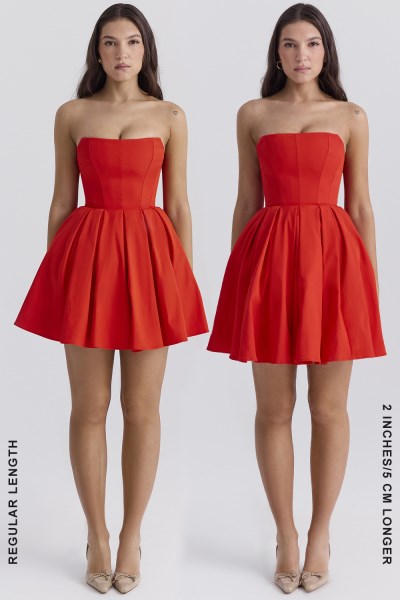 'Emmanuela' is beautifully constructed and this ultra feminine mini style is cut from soft peached twill. It has a strapless, corseted bodice to cinch your waist to highlight your figure and a perfectly pleated mini skirt. The tulle underskirt creates pretty volume and 'Emmanuela' is a favourite for sunny destinations. Accessorise with a delicate necklace and barely there heels. It zips to the back for easy on. Taller girls, we heard you and this is available in two lengths, our regular mini length and 2 inches / 5cm longer. Regular: Approx 69cm and Longer: Approx 74cm. WHERE TO WEAR
