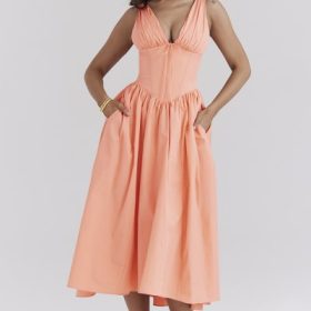 Channeling understated elegance, 'Emmelina' is an effortless wear-anywhere style in a gorgeous sorbet hue. The cotton rich fabric is blended with stretch and beautifully designed with a gathered bust. The plunge neckline perfectly mirrors the open back and the bodice is corseted to cinch the waist. The floaty midi skirt swishes with every step, adding that ultra feminine feel and it zips to the back for easy on. 'Emmelina' will be your go-to dress from Spring through to Summer. Wear yours with tonal heels like 'Lola' in sunkissed. The 'Regular Cup' option suits cup size A-C whilst the 'Bigger Cup' option suits cup size D-E.