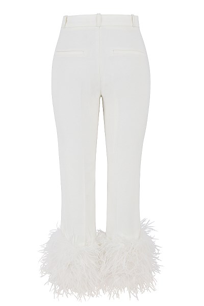 'Fae' are made from an ivory stretch crepe in a slim, straight leg silhouette and embellished with wispy feathers to the cropped cuffs that sit just above the ankle. They rest comfortably on the natural waist and are fitted with belt loops for the option to add a belt and cinch the fit. 'Fae' are fully lined to the knee and have a concealed button fastening to the front. Wear yours with the 'Iman' Blazer for a matching, glamorous vibe as our designers intended.