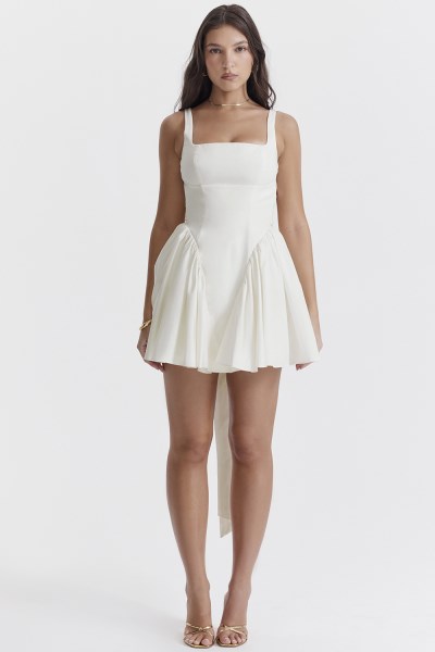 THE dress for warm spring and summer days, our 'Florianne' mini dress has a striking silhouette. It's cut from ivory cotton and the close fitting bodice is fitted with our incredible corsetry boning that turns to reveal an ultra low open back, complete with an oversized bow for feminine drama. We love the figure defining seams and 'Florianne' has a pretty voluminous skirt that's fitted with a discreet tulle fabric to hold the shape perfectly. It's fully lined for comfort and zips up the back for easy on. Wear yours with neutral heels like our 'Ghost' clear strap sandals for your next special spring and summer event. The 'Regular Cup' option suits cup size A-C whilst the 'Bigger Cup' option suits cup size D-E. Taller girls, we heard you and these are available in two lengths, our regular mini length and 2 inches / 5cm longer. Regular length : Approx 87cm and Longer length: Approx 93cm.