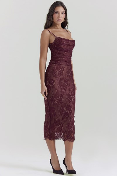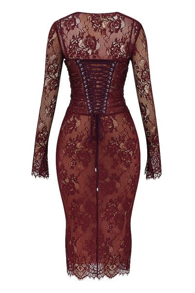 It's easy to fall in love with our gorgeous 'Gaia' dress as the delicate lace and beautiful rich colouring make it feel extra special. Made from an exquisite, delicate, scalloped lace in deep Claret, 'Gaia' is underpinned with our figure cinching cafe power mesh in a neutral cafe-au-lait tone. Gaia features a corseted bodice that's gorgeously gathered with lace up detailing to the back.
