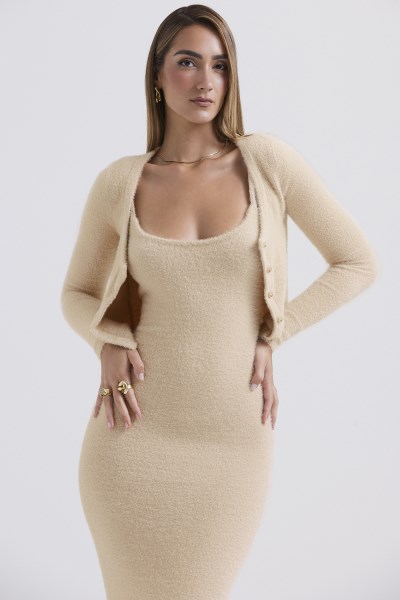 Our 'Gene' cardigan is cosy, chic and super versatile. The soft fluffy knit creates a brushed effect, making 'Gene' super comfy to wear. It has a rounded scoop neckline and a classic button front in a flattering close fit. Layer yours over our 'Fayette' dress in beige for the perfect match. We recommend folding our knitwear as it will stretch on a hanger.