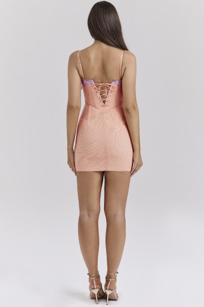 Meet 'Harper', the mini version to our much loved 'Aiza' dress. Cut from stretch mesh for a sculpting silhouette, it's the pretty details of the lace up back and gorgeous sorbet hue that makes 'Harper' the most delightful creation. It has underwired cups, topped with adjustable straps and a corseted bodice to snatch the waist.