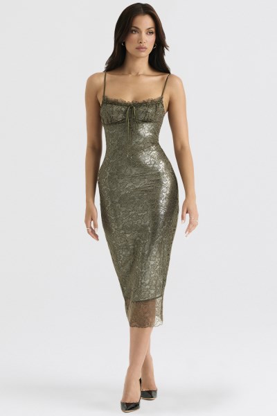 Our 'Isla' dress updates the classic slip dress into a glamorous and elegant party piece. Cut for a close fit in a romantic floral lace that's scalloped at the neckline and backed in an ultra feminine metallic shimmer georgette for a sultry vibe. The gathered bust has a drawstring tie and offers gentle support, held by slender satin shoulder straps. It has a zip to the back for easy on and we love this styled with the highest heels like our 'Paris' heels in black suede for those glam functions and events.