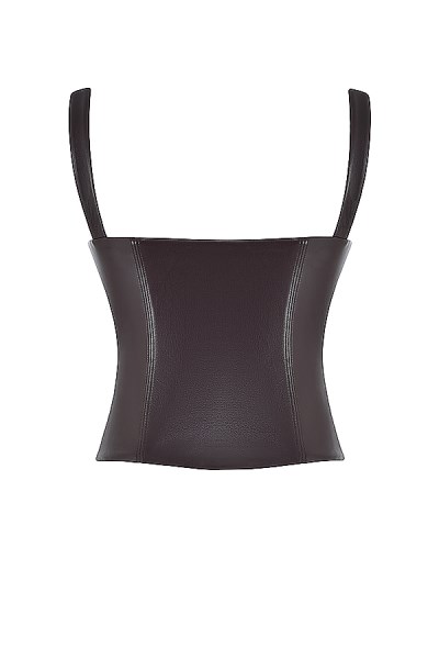 Cut from matte vegan leather in a smooth bitter chocolate hue, 'James' feels so soft and supple just like the real thing. It has a flattering gathered neckline with an underbust seam to shape the bust beautifully. The supportive boning cinches the waist that defines the shape for a structured fit and the hem sits below the natural waistline in a longer silhouette. The inner layer creates a comfortable and non sticky finish and the hook and eye detail to the front makes for easy on and off. Style yours for evenings out with our 'Cameron' Trousers in caramel. As corsets are designed to fit snugly, we recommend sizing up if you are between sizes.
