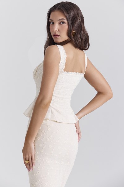 Romantic details, delicate hues and pretty pieces, 'Jean' is the perfect invitation to our Capri collection. Classically feminine with a vintage feel, 'Jean' is cut from a beautifully embroidered cotton-rich broderie anglais and has a fitted button front bodice with a sweetly gathered bust and floaty peplum hem. Compliment this gorgeous creation with our 'Lana' maxi skirt and neutral sandals like 'Marivel' for dreamy date nights. The 'Regular Cup' option suits cup size A-C whilst the 'Bigger Cup' option suits cup size D-E. WHERE TO WEAR: