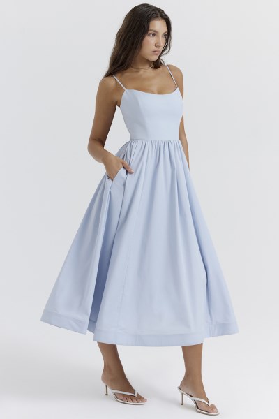 Feminine, floaty and perfect for Summer. Cut from breezy stretch cotton for a fresh feel in soft blue, 'Lolita' has a boned bodice to cinch the waist,