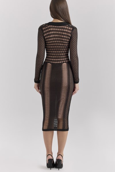 The 'Loula' dress is a masterclass in understated glamour. Crafted from a luxurious metallic yarn, this midi-length piece effortlessly combines stretch and structure for a flattering, body-hugging fit. The dramatic plunge neckline adds a sultry touch, balanced by long sleeves that make it perfect for cooler weather. Intricate knit detailing creates a stunning interplay of texture and shimmer, while the elegant silhouette transitions seamlessly from day to night. Whether paired with heels for an evening event or styled more casually, 'Loula' is your go-to for weather-appropriate sophistication with a touch of sparkle. Made with Viscose, a natural fibre made from regenerated cellulose. Known for its smooth and luxurious properties. TEAM YOURS WITH: