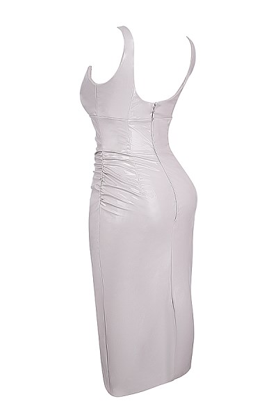 'Madeleine' is expertly cut for a figure sculpting fit from glossy vinyl that's gathered to enhance your figure. The deep plunge neckline perfectly highlights your décolletage and we love how the sleek silhouette showcases every curve. It zips to the back for easy on and the split to hem creates easy movement. Wear yours with barely there mules like 'Lucent'.
