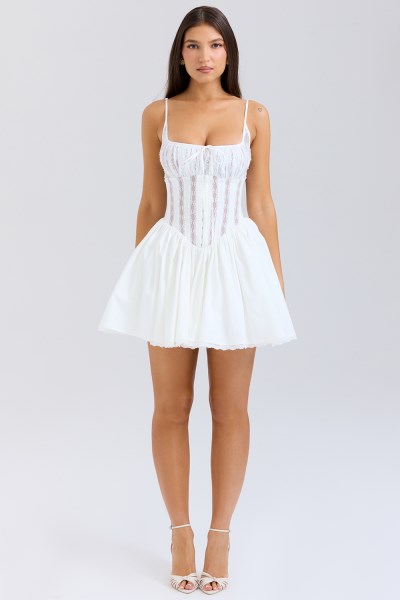 Our 'Rosaria' mini dress is dainty and delicate and trimmed with a gorgeous sheer lace to the bodice. Fully corseted to snatch the waist, 'Rosaria' has a pretty gathered bust, hook and eye detailing and barely-there straps. We love how the contrast lining tempers the sheerness while creating a skin baring illusion. The floaty mini skirt kicks out to a voluminous shape thanks to the soft tulle underskirt. 'Rosaria' zips to the back for easy on. Wear yours with our tonal heels. The 'Regular' cup option suits cup size A-C whilst the 'Bigger' cup option suits cup size D-E. Taller girls, we heard you and this is available in two lengths, our regular mini length and 2 inches / 5cm longer. Regular: Approx 81cm and Longer: 86cm. WHERE TO WEAR: