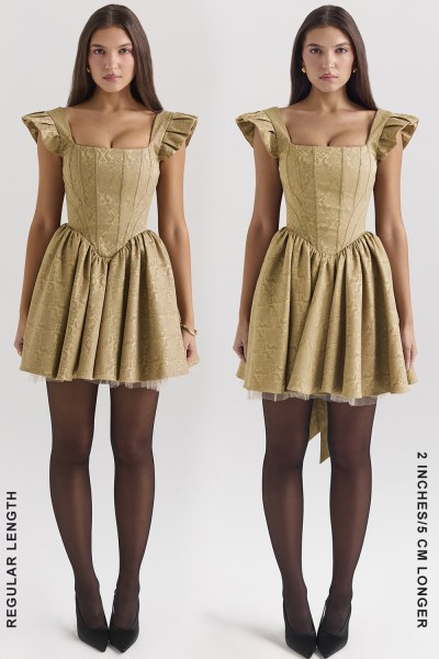 Turn heads and steal hearts in the 'Saasha' Gold Jacquard Dress by House of CB – where vintage romance meets modern flair. With its corseted bodice that hugs in all the right places and a playful oversized bow you can add or remove, 'Saasha' is here to make you the star of the night. The flirty flared skirt with a tulle underskirt gives you that twirl-worthy volume for unforgettable entrances (and exits!). Perfect for weddings, fancy soirées, or any occasion that demands a little extra sparkle, 'Saasha' is your golden ticket to glamour. They say length doesn’t matter, but we think otherwise. That’s why this dress is available in two lengths – 'Regular' and 'Longer' (see below for specific measurements). WHERE TO WEAR: