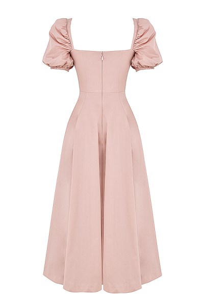 'Tallulah's Crisp fresh look has us dreaming of those garden parties and summer trips. It's cut from our stretch cotton poplin for a fresh feel in a pretty blush hue. The bodice has corsetry boning to the front, back and sides for that perfect cinched hourglass shape and the lightly shaped cups are lined for a comfortable fit. The pretty puff sleeves add to the fun and floaty vibe of 'Tallulah' and we love the way that the side thigh split shows just a flash of thigh as you walk. 'Tallulah' is just perfect for girls who wanna be girls who wanna be sexy.