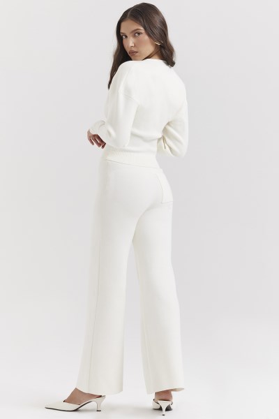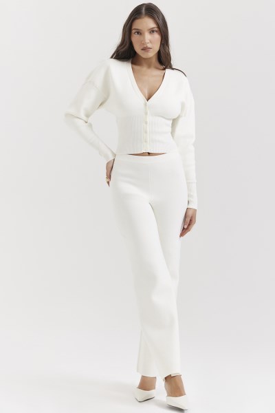 'Vanna' are our ultra luxe cotton blend trousers in a fit and flare silhouette. They sit mid-rise at the waist with a snug fit over your hips before falling to a slightly flared hem. They pull on for easy wear and have a deep back pocket. 'Vanna' pair so well with our 'Noor' cardigan for a chic co-ord. We recommend folding our knitwear as it will stretch on a hanger.